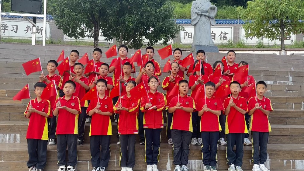 学生身着整洁校服列队整齐,抬手、展臂间动作铿锵有力,每一次挥舞红旗都尽显少年蓬勃朝气;激昂曲调萦绕校园,每一个节拍都满含对祖国的赤诚热爱,用肢体语言传递青春担当。
