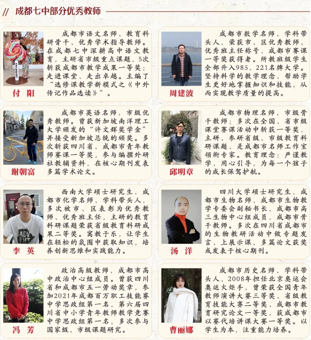 学校始终秉持“用一流待遇,吸引一流人才,做一流服务,办一流学校”理念,在全国高薪聘请具有奋斗精神的省市县师德标兵、优秀班主任、优秀教师、学科带头人等名优人才来校任教,形成了一流教师团队。与成都七中深度合作,通过“双师课堂”实现优质教育资源实时共享。